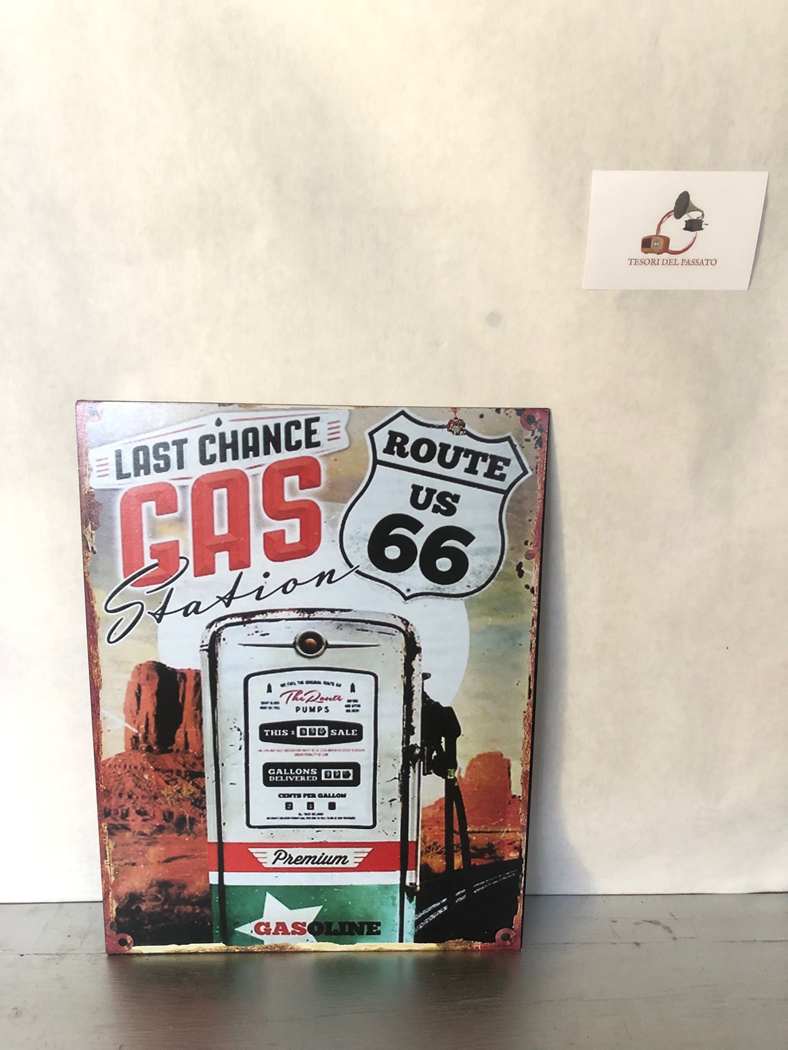 Rivivi l’atmosfera dei viaggi on the road americani con questa targa vintage in metallo Route 66 Gas Station, decorata con pompa di benzina d’epoca e scritta “Last Chance Gas Station”. Un accessorio dal fascino retrò che richiama lo stile delle vecchie stazioni di servizio lungo la leggendaria Route 66.