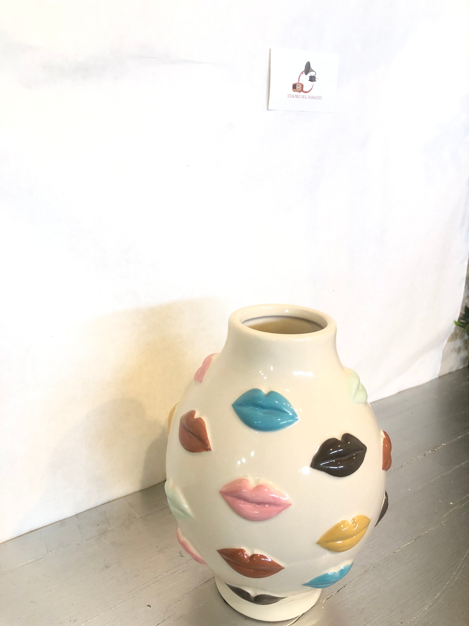 Ogni lato del vaso è arricchito da labbra tridimensionali in colori vivaci – rosso, rosa, azzurro, marrone e giallo – che creano un effetto artistico sorprendente e divertente.